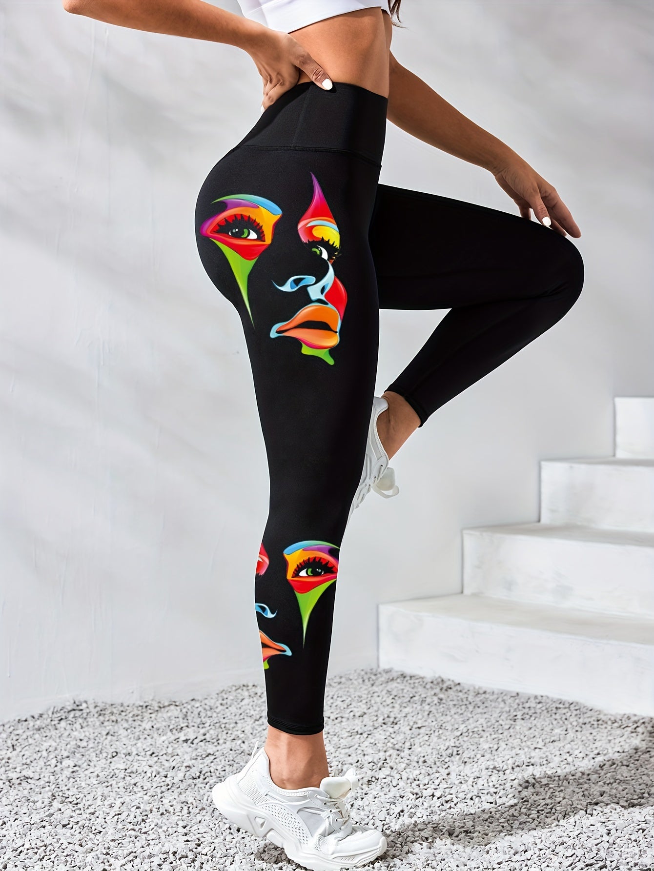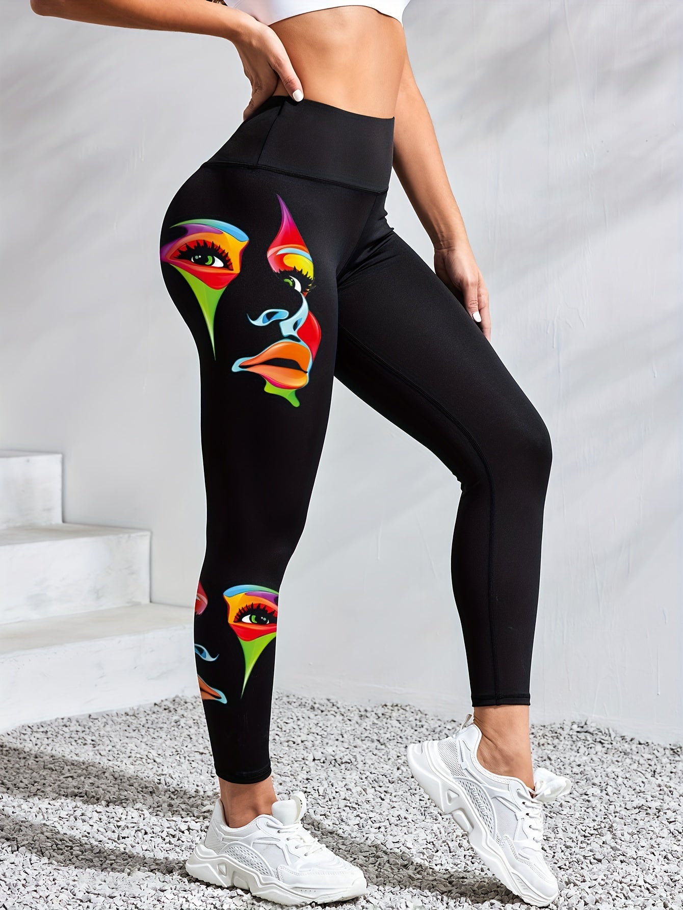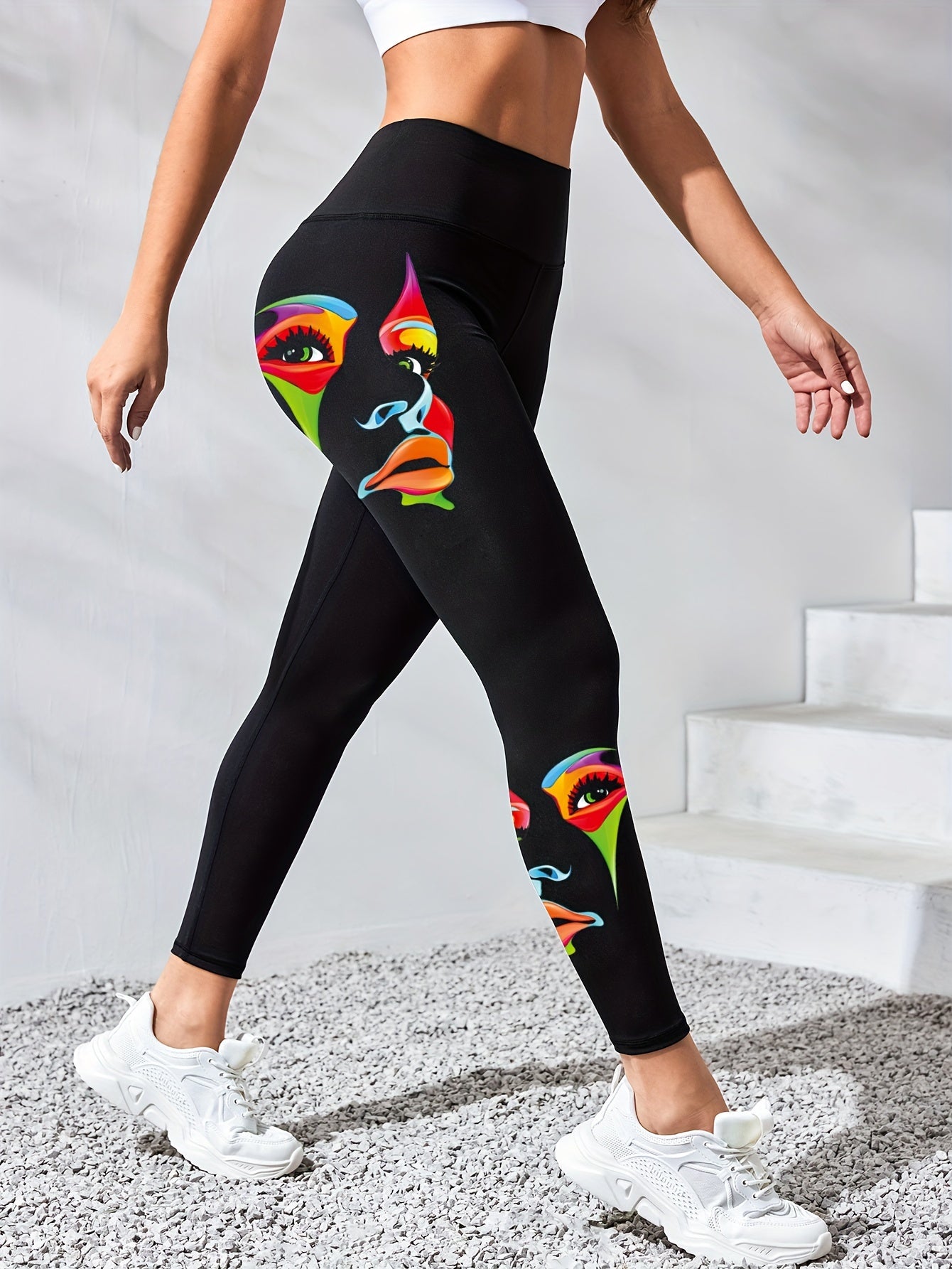 Naisten korkeavyötäröiset joogaleggingsit ainutlaatuisella kasvonaamiokuviolla, joustavat kuntoilutrikoot kuntosalille